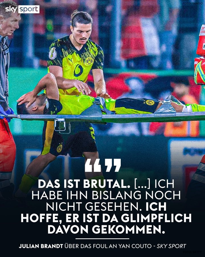 8月19日德国天空体育消息,多特蒙德后防新星扬-库托在德国杯较量中重伤离场,最终由担架护送离场。